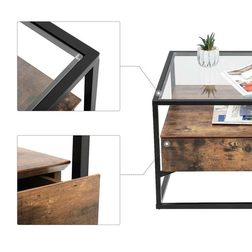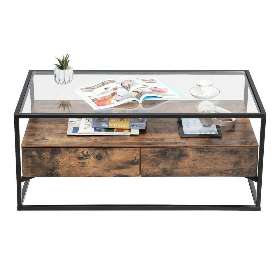 - Ein schwarzer Eisenrahmen, eine elegante Glasoberfläche und dazwischen eine Vintage-Ablage in Holzoptik – welches diesem Wohnzimmertisch sein einzigartiges Aussehen verleiht
