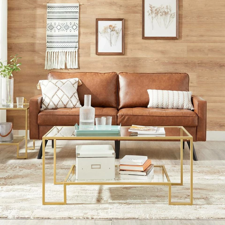 - Was Sie bekommen: Einen Couchtisch, der über 2 Glasablagen und ein goldenes Metallgestell verfügt, und eine Möglichkeit, Ihr Wohnzimmer zum Glänzen zu bringen.