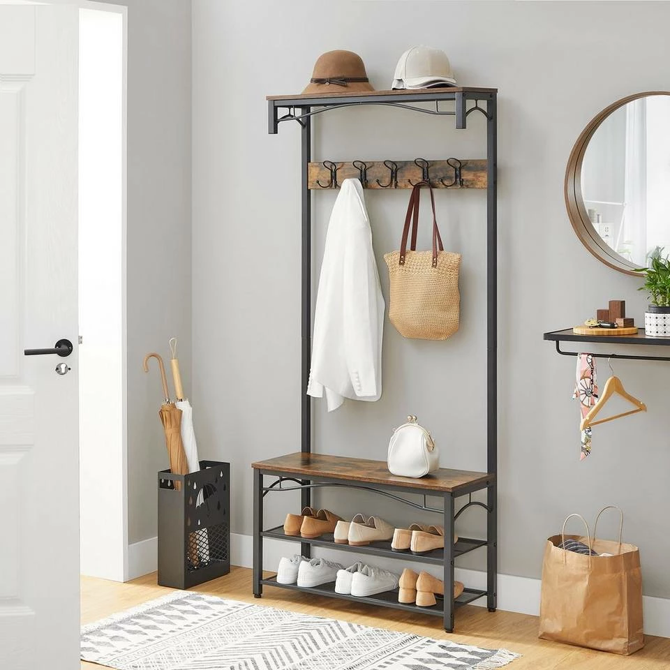 - Wenn Sie kommen nach Hause und hängen Ihren Mantel einfach an 5 Doppelhaken auf, dann setzen Sie sich gemütlich auf die Bank und stellen die Schuhe auf 2 Metallablagen ab