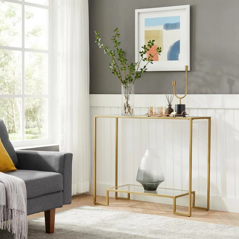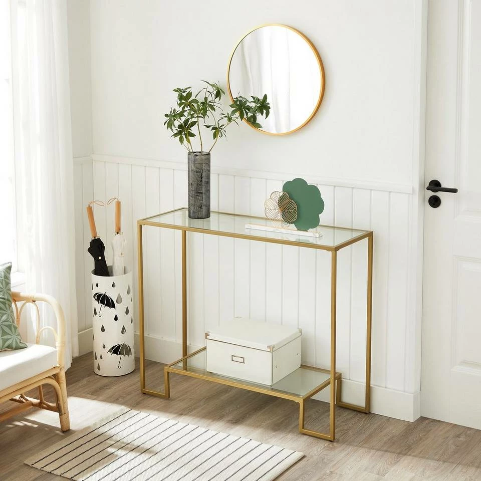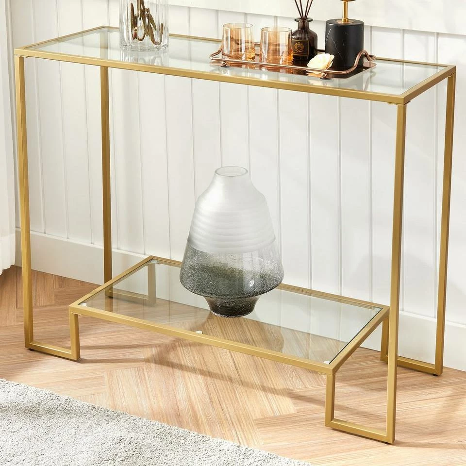 - Einen Konsolentisch mit 2 Glasablagen und goldenem Metallgestell sowie die Möglichkeit, Ihren Flur, Ihr Wohnzimmer oder Ihr Schlafzimmer zum Glänzen zu bringen