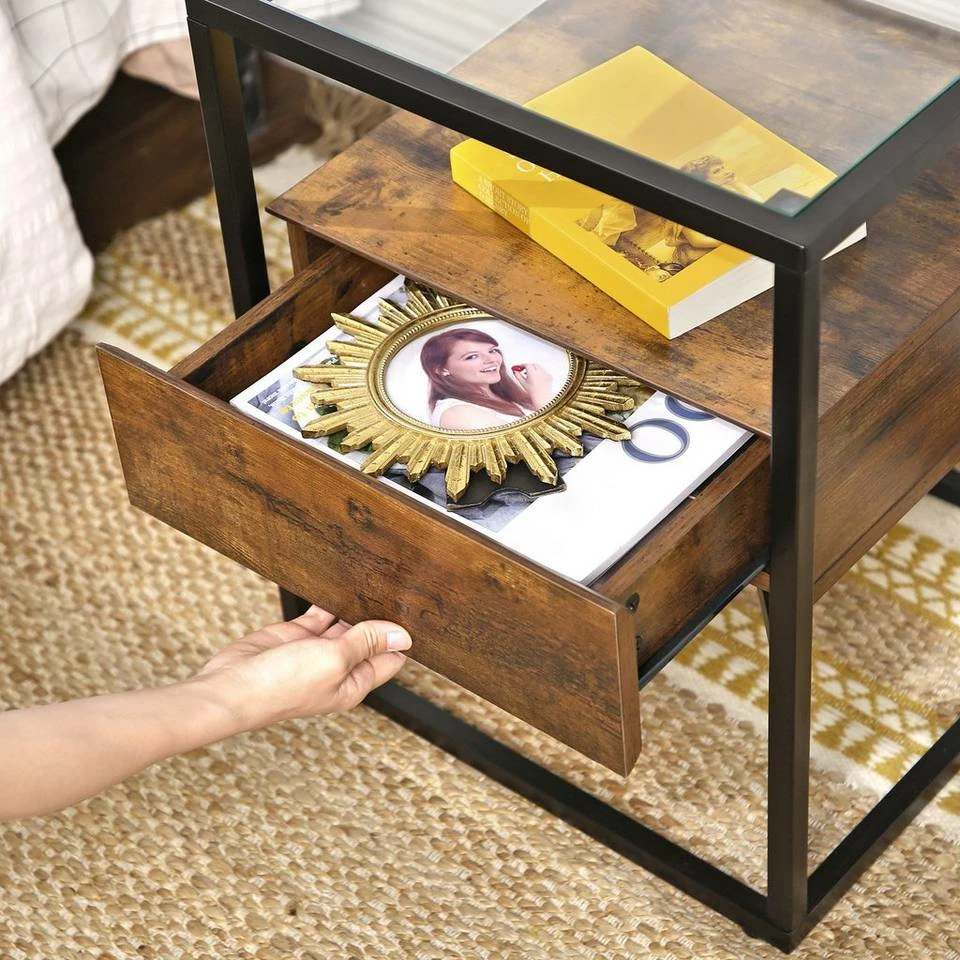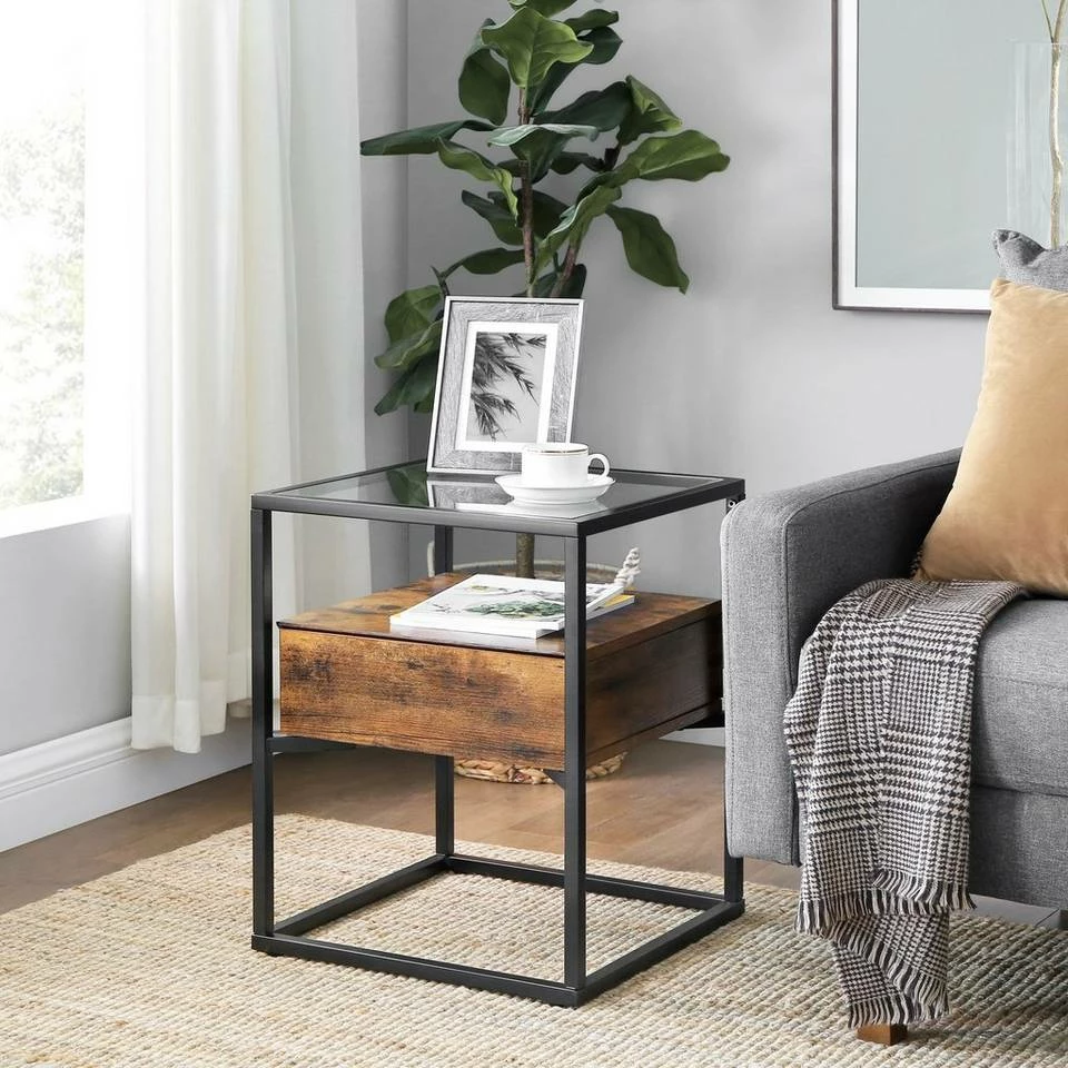 - SPIEL DER MATERIALIEN: Ein schwarzer Eisenrahmen, eine elegante Glasoberfläche und dazwischen eine Vintage-Ablage in Holzoptik