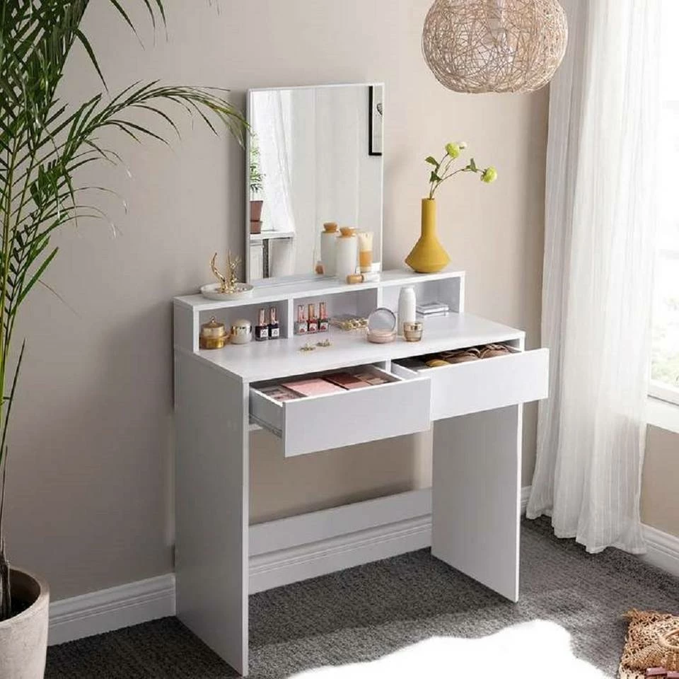 - WAS SIE BEKOMMEN? Einen Frisiertisch mit 2 Schubladen, 3 offenen Fächern und einem großen Spiegel, in dem Sie sich täglich bewundern können. Sie erhalten zudem einen Kippschutz