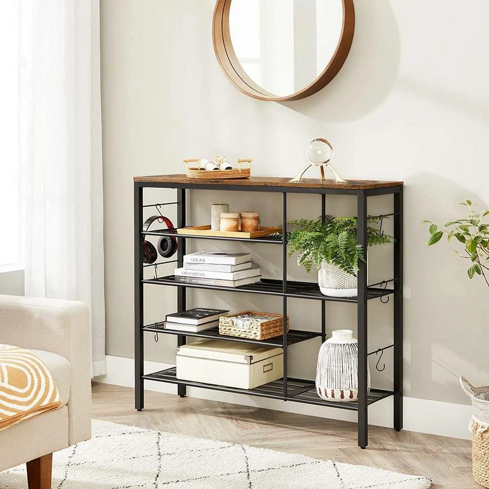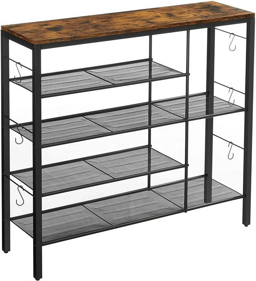 - Ein charmantes Zuhause für Ihre Schuhe: Ein schwarzes Stahlgestell, eine vintagebraune Spanplatte und Gitterablagen