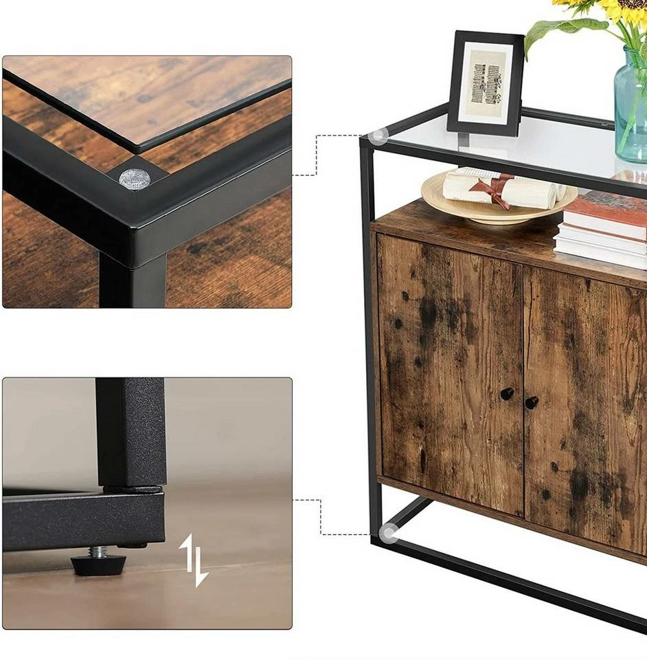 - Stellen Sie eine Blumenvase auf die Glasoberfläche, legen Sie Bücher auf die Ablage und verstauen Sie Geschirr auf den 3 höhenverstellbaren Regalebenen im Inneren des Schranks