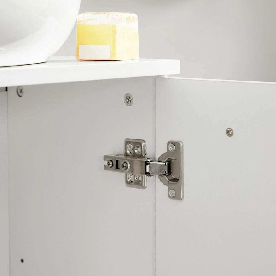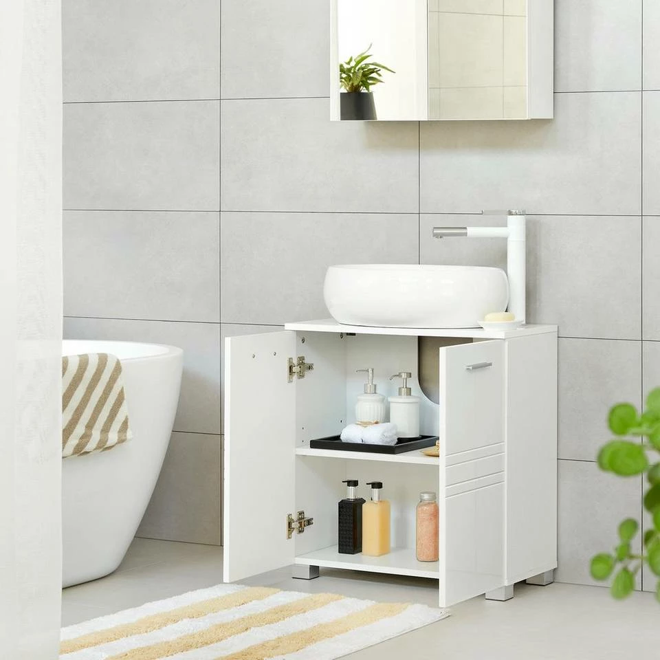 - Alles in Ordnung im Bad: Wenn Handtücher und Körperpflegeprodukte unordentlich in Ihrem Bad herumliegen, bewahren Sie sie hinter der Doppeltür dieses Waschbeckenunterschranks auf